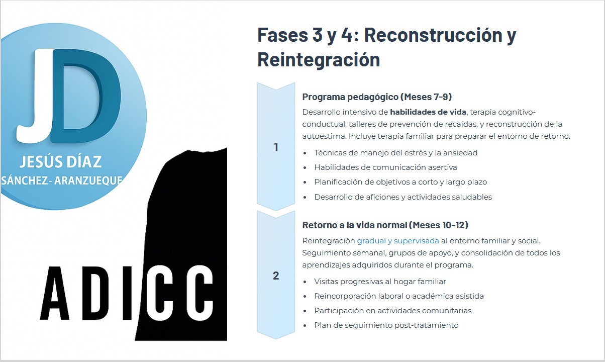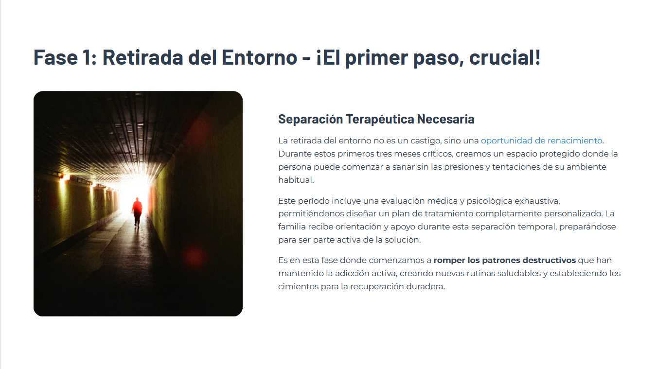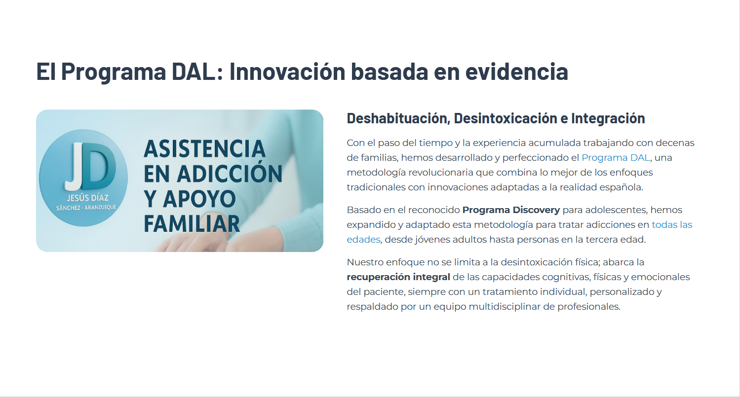«Si has llegado hasta aquí, no es casualidad: Quince años de experiencia y decenas de familias recuperadas avalan nuestro compromiso y trabajo» Soy Jesús Díaz Sánchez-Aranzueque, director de Grupo JD (dedicada a otros servicios sanitarios), un profesional especializado en programas para asistir y recuperar a personas y familias con problemas y trastornos por Alcoholismo y Adicciones. Nací en Madrid en 1969 y tras una larga etapa en el mundo de la banca (activos y pasivos bancarios y financieros) y por una serie de factores en aquel momento descubro mi verdadera vocación, que es la que hace ya más de veinte años me permite ser muy feliz en mi día a día con mi trabajo ayudando a personas que necesitan recuperar su salud, abandonando adicciones, superando el miedo para curarse y reinventarse. He ido a lo largo de estos años preparándome para ser un apoyo relevante en la vida de personas y familias con urgentes necesidades por culpa de las drogas, alcohol y sustancias tóxicas. Me reinvento y estudio constantemente, actualmente estoy estudiando el grado de psicología. Con el paso del tiempo y la experiencia que me aportan estas personas con sus familias he ido perfeccionando y desarrollando un programa llamado «DAL», que consiste en la deshabituación, desintoxicación e integración del enfermo basado en el famoso «programa discovery» (para adolescentes) adaptándolo a todas las edades. Nuestra misión es la recuperación total de estas personas y sus familias, porque no sufre sólo el enfermo, sino que hay unos daños colaterales terribles también en la familia. Nuestro objetivo es trabajar con un procedimiento que ha demostrado ser útil a decenas de familias por sus resultados, recuperando a la persona, su entorno y las capacidades cognitivas, físicas y emocionales del enfermo con un enfoque individual, personal y profesional multidisciplinar. Es un programa para tratar el alcoholismo y las drogas duras como la cocaína, heroína, cannabis, drogas de nuevo diseño, etc. Es un programa de un año que se realiza en cuatro fases de tres meses cada una: 1.- Retirada del entorno, 2.-Desintoxicación, 3.-Programa Pedagógico y 4.- Retorno a su vida normal, devolviendo esa serenidad, calma y tranquilidad tan necesarias para continuar.