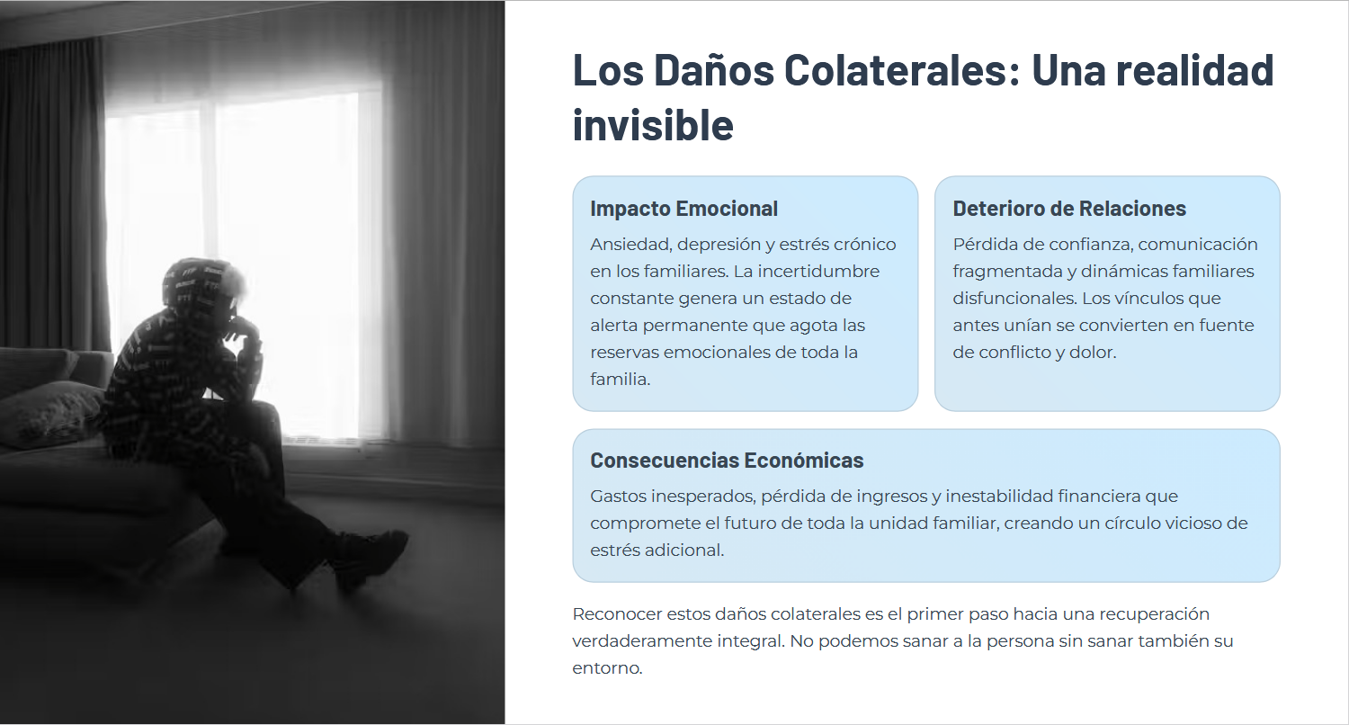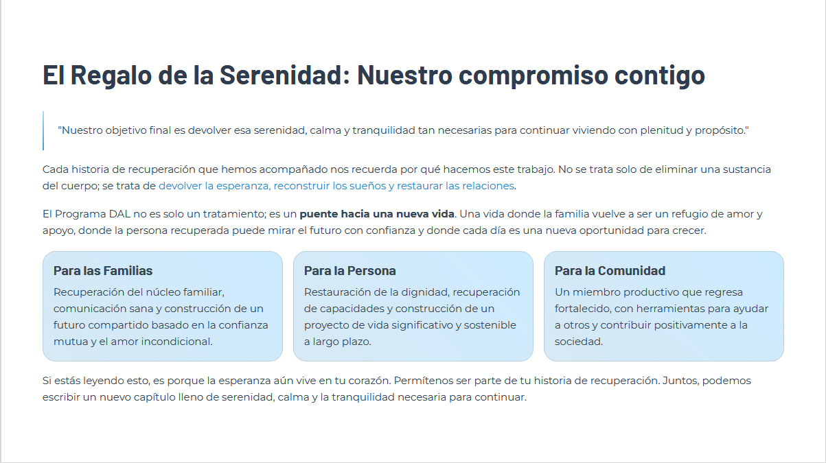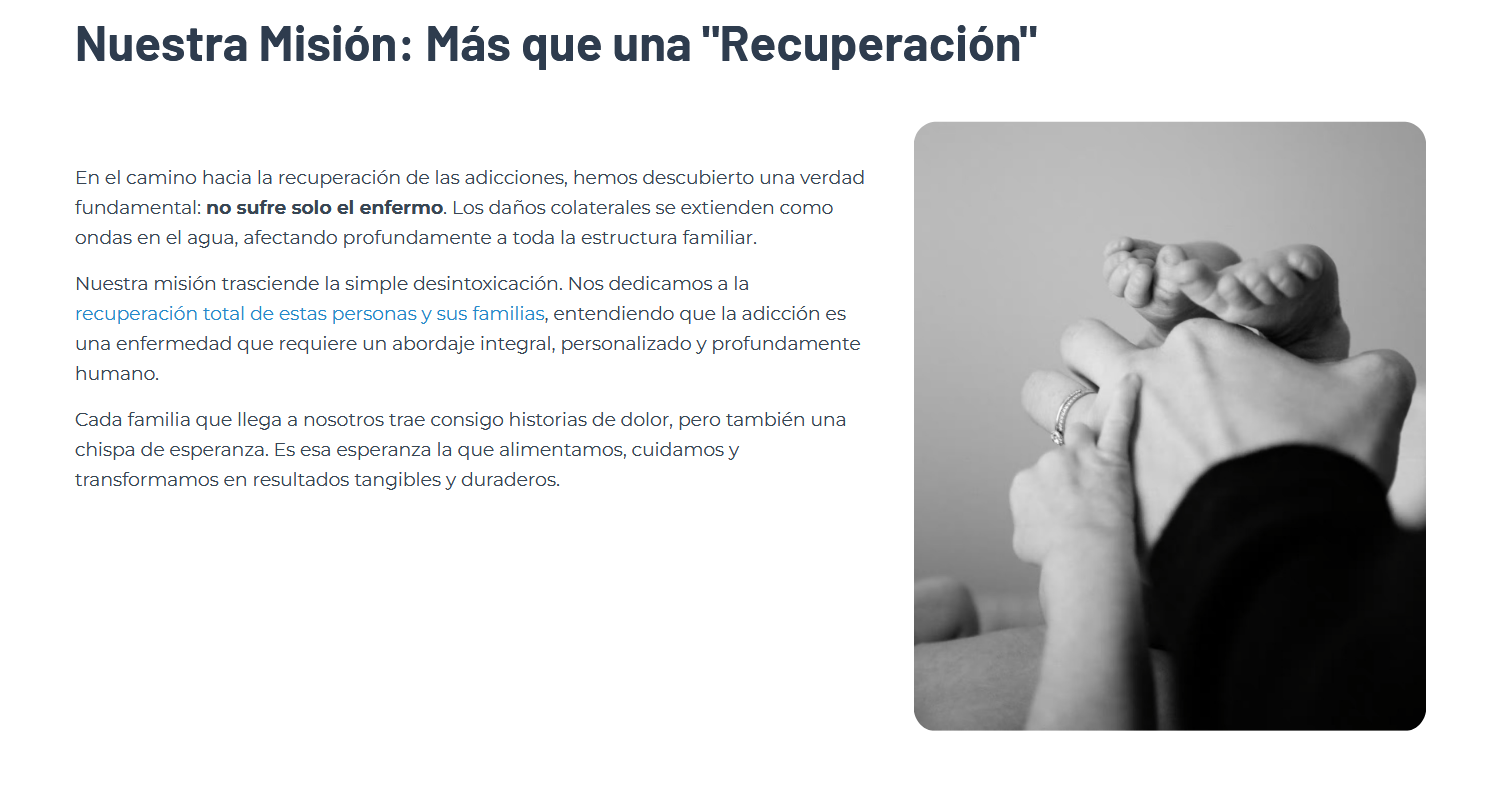 «Si has llegado hasta aquí, no es casualidad: Quince años de experiencia y decenas de familias recuperadas avalan nuestro compromiso y trabajo» Soy Jesús Díaz Sánchez-Aranzueque, director de Grupo JD (dedicada a otros servicios sanitarios), un profesional especializado en programas para asistir y recuperar a personas y familias con problemas y trastornos por Alcoholismo y Adicciones. Nací en Madrid en 1969 y tras una larga etapa en el mundo de la banca (activos y pasivos bancarios y financieros) y por una serie de factores en aquel momento descubro mi verdadera vocación, que es la que hace ya más de veinte años me permite ser muy feliz en mi día a día con mi trabajo ayudando a personas que necesitan recuperar su salud, abandonando adicciones, superando el miedo para curarse y reinventarse. He ido a lo largo de estos años preparándome para ser un apoyo relevante en la vida de personas y familias con urgentes necesidades por culpa de las drogas, alcohol y sustancias tóxicas. Me reinvento y estudio constantemente, actualmente estoy estudiando el grado de psicología. Con el paso del tiempo y la experiencia que me aportan estas personas con sus familias he ido perfeccionando y desarrollando un programa llamado «DAL», que consiste en la deshabituación, desintoxicación e integración del enfermo basado en el famoso «programa discovery» (para adolescentes) adaptándolo a todas las edades. Nuestra misión es la recuperación total de estas personas y sus familias, porque no sufre sólo el enfermo, sino que hay unos daños colaterales terribles también en la familia. Nuestro objetivo es trabajar con un procedimiento que ha demostrado ser útil a decenas de familias por sus resultados, recuperando a la persona, su entorno y las capacidades cognitivas, físicas y emocionales del enfermo con un enfoque individual, personal y profesional multidisciplinar. Es un programa para tratar el alcoholismo y las drogas duras como la cocaína, heroína, cannabis, drogas de nuevo diseño, etc. Es un programa de un año que se realiza en cuatro fases de tres meses cada una: 1.- Retirada del entorno, 2.-Desintoxicación, 3.-Programa Pedagógico y 4.- Retorno a su vida normal, devolviendo esa serenidad, calma y tranquilidad tan necesarias para continuar.